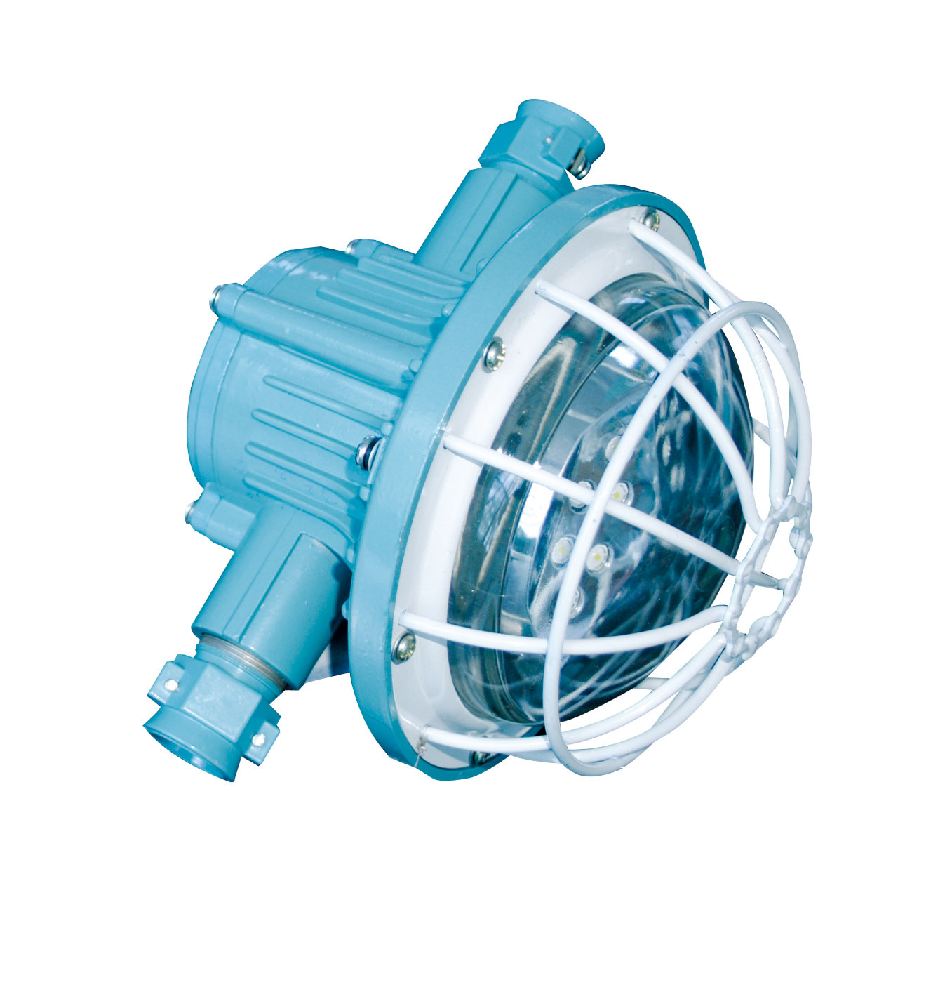 LED燈由上蓋、上殼體、下殼體、防爆透明玻璃罩、護(hù)罩等組成,上蓋與上殼體用M4螺釘連接,下殼體用M6螺釘與上殼體相連。防爆透明玻璃罩、護(hù)罩用M4螺釘固定在下殼體上。上殼體外有M4外接地螺釘、銘牌等。上殼體內(nèi)有接線板、M4內(nèi)接地螺釘、LED驅(qū)動(dòng)電源板。下殼體內(nèi)有密封墊、防爆透明玻璃罩、LED光源、散熱板。散熱板通過上殼體將光源熱量散發(fā)到燈體外。上蓋、上殼體、下殼體、防爆透明玻璃罩之間均有符合規(guī)定的隔爆接合面隔爆。